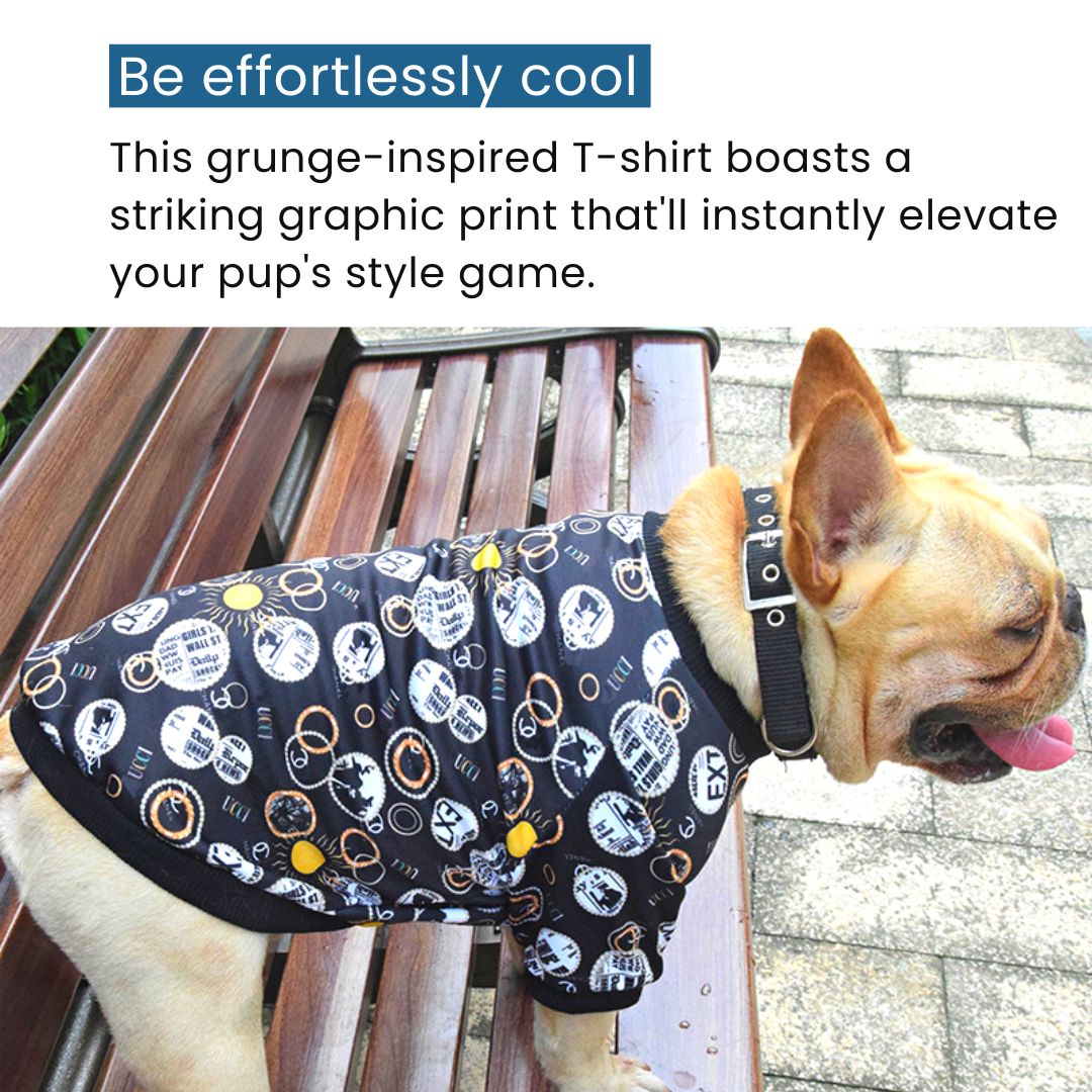 The shirt features captivating graphic prints and labels that reflect a grunge aesthetic, instantly elevating your dog’s style game. Whether your pup is lounging around or out and about, they're sure to make an impression while looking doggedly-pawsome.