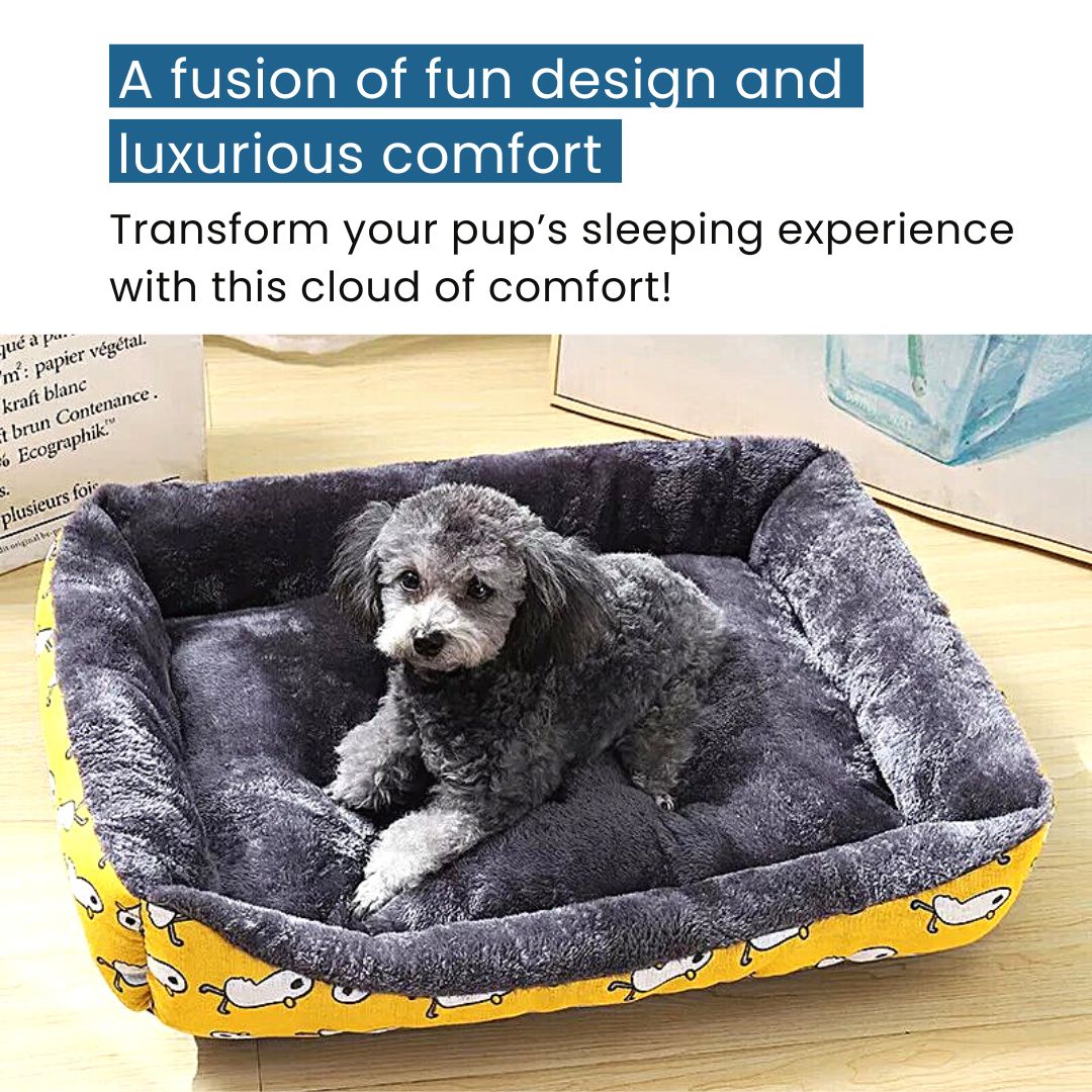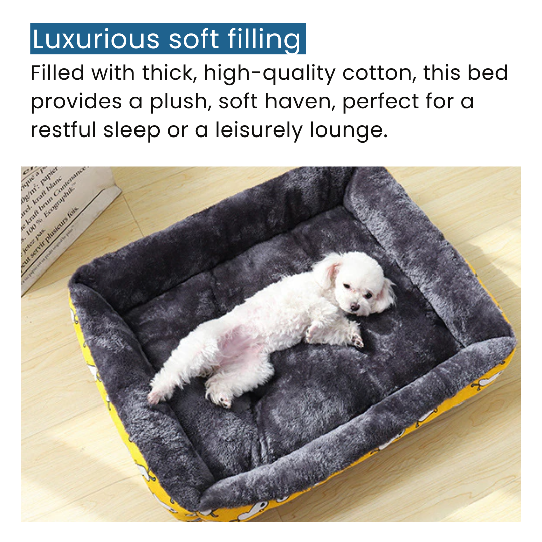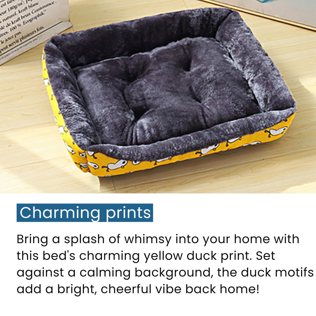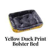 Welcome to the world of sweet slumber with this bolster bed, a perfect blend of adorable aesthetics and supreme comfort for your precious pup. Adorned with a sunny yellow duck print, this bed infuses a burst of joy and playfulness into your home. It's designed to be a delightful addition that captures hearts and sparks smiles.