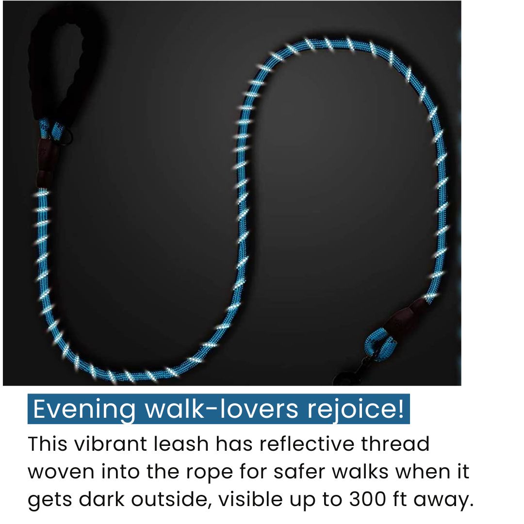 Dogs and owners who love walks in the evening rejoice! This vibrant leash has reflective thread woven into the rope for safer walks when it gets dark outside, drastically increasing your dog’s visibility from over 300 feet away at night!