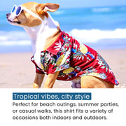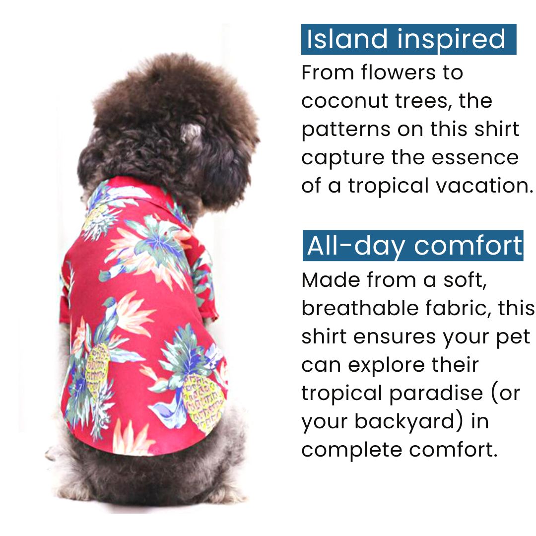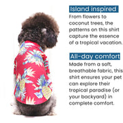 Set against a vivacious red background, this shirt boasts a lavish pattern of tropical flora, palm trees, and island motifs. The red hue adds an exotic and energetic vibe that's impossible to ignore, making your dog the center of attention wherever you go. Also available in Blue Print, Black Print, Pink Print, White Print, and Coconut White.