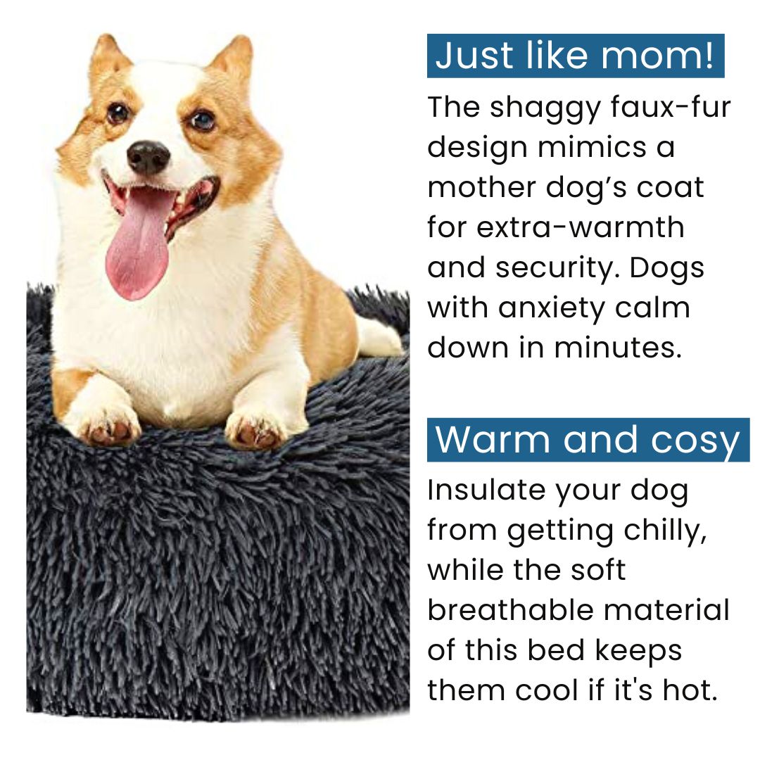 The shaggy faux-fur design mimics a mother dog’s coat, giving your dog the chance to reminisce about being cradled by their mommy while they rest. Dogs with anxiety calm down in minutes.