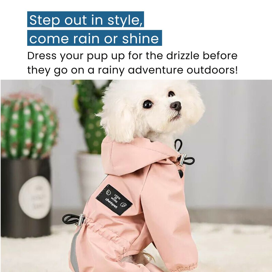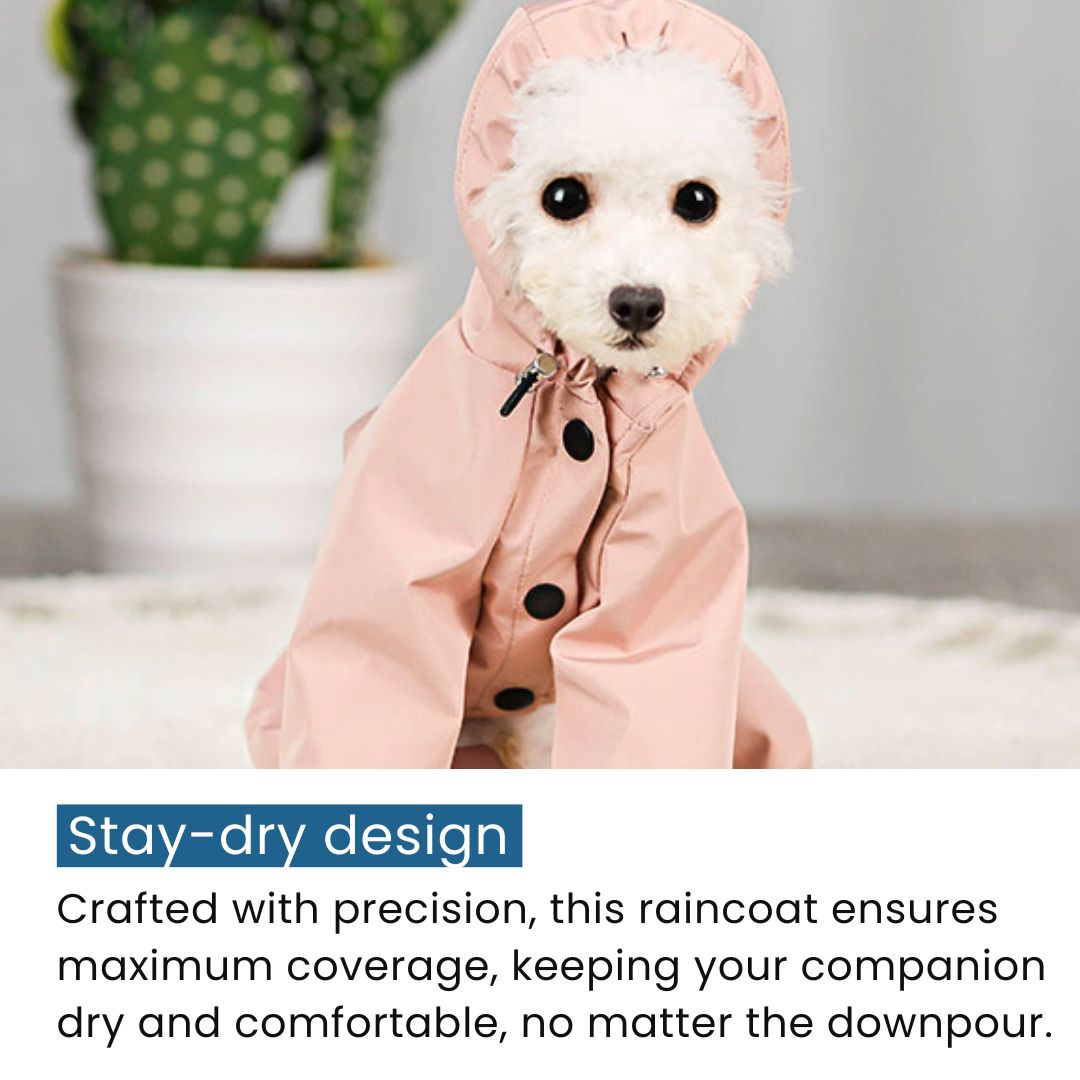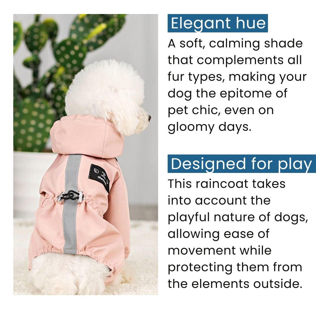 Drenched in a delicate shade of pastel pink, this raincoat evokes the romance of rose gardens kissed by morning dew. Its gentle hue paints a picture of blooming blossoms, ensuring your furry fashionista remains the showstopper, rain or shine.