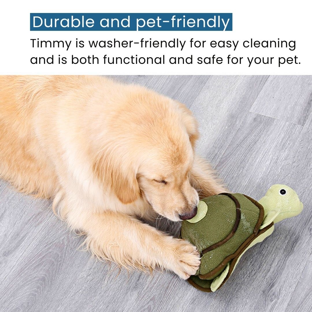 Sometimes, Timmy gets a little shy and might hide in his shell. When that happens, fill him with some treats inside his pockets so you can teach your dog how to encourage Timmy to come out of his shell! This is a fun and interactive way to play with your dog, which also improves your pet’s problem-solving skills.